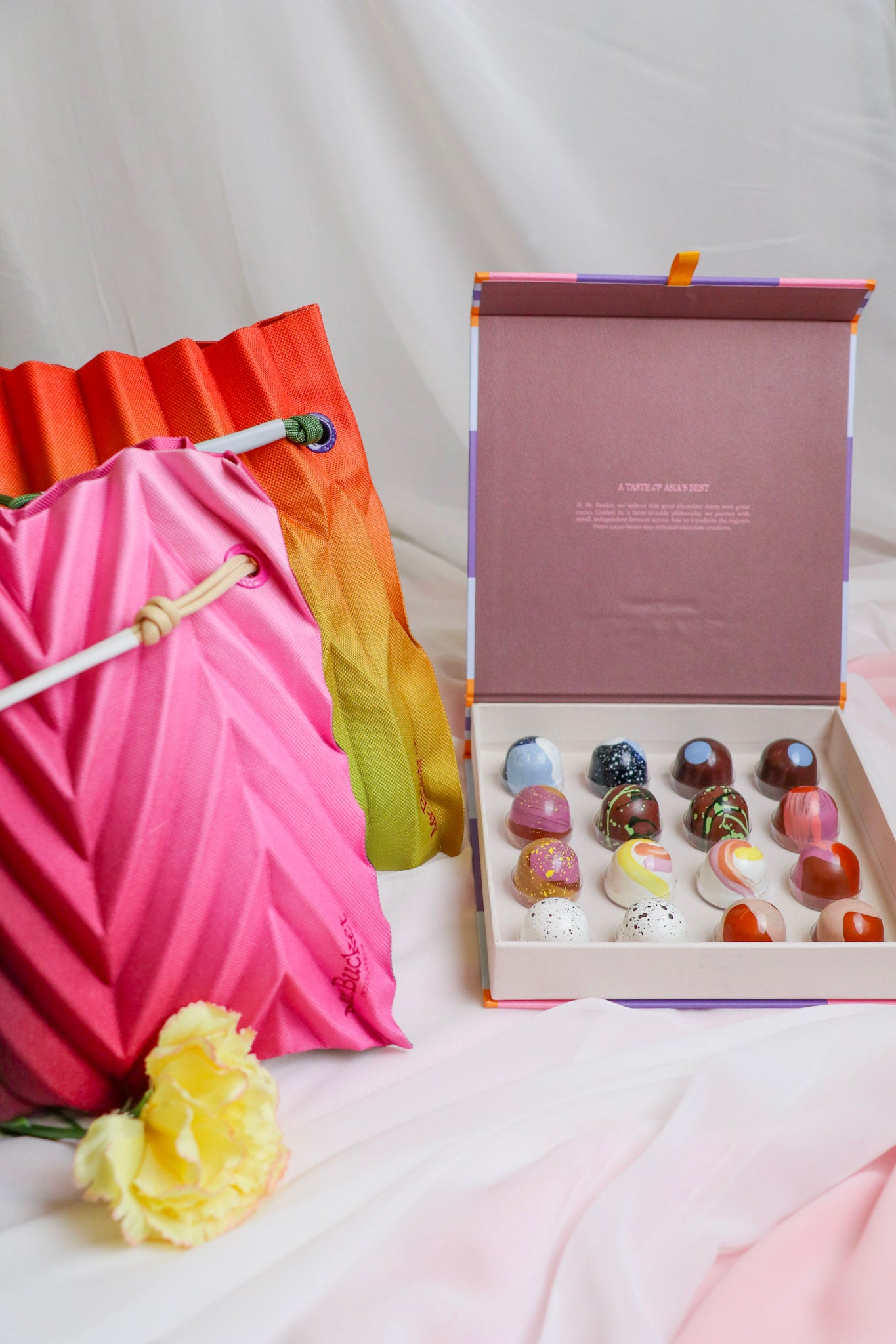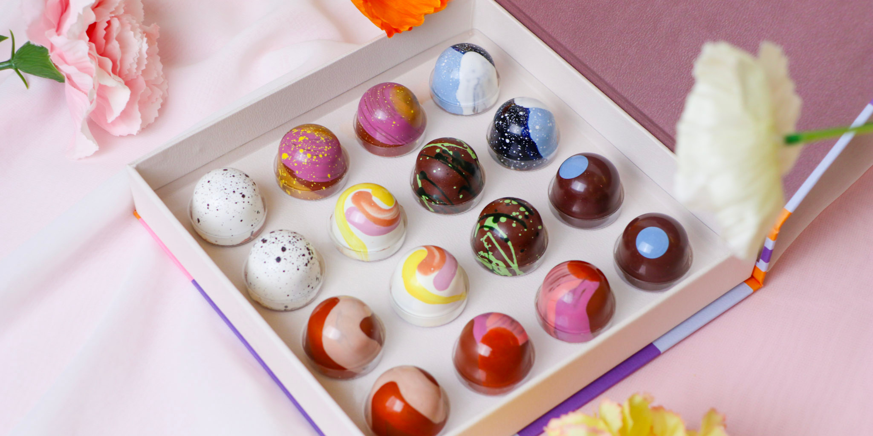 ...knack for making world-class chocolate bonbons – each coated in paint swipes of colour and filled with ganache spiked with fun flavours that dance on your tongue as it melts.
