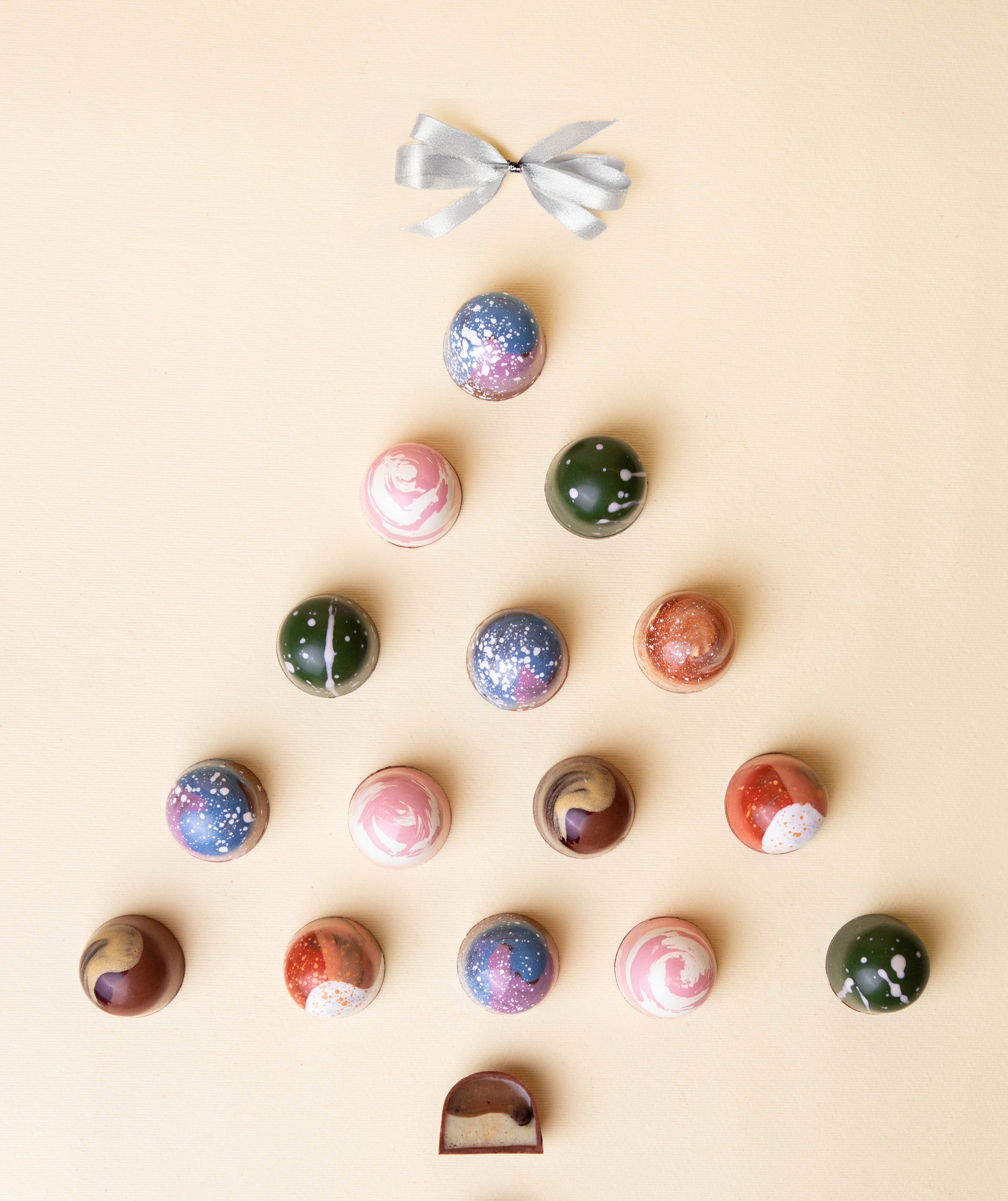 ...knack for making world-class chocolate bonbons – each coated in paint swipes of colour and filled with ganache spiked with fun flavours that dance on your tongue as it melts.