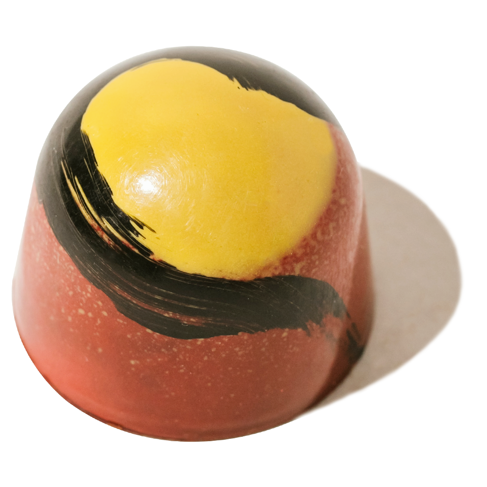 Comes with a burst of citrus notes and an element of surprise. Featuring refreshing calamansi white chocolate ganache and a layer of dark chocolate popping candy almond praline.